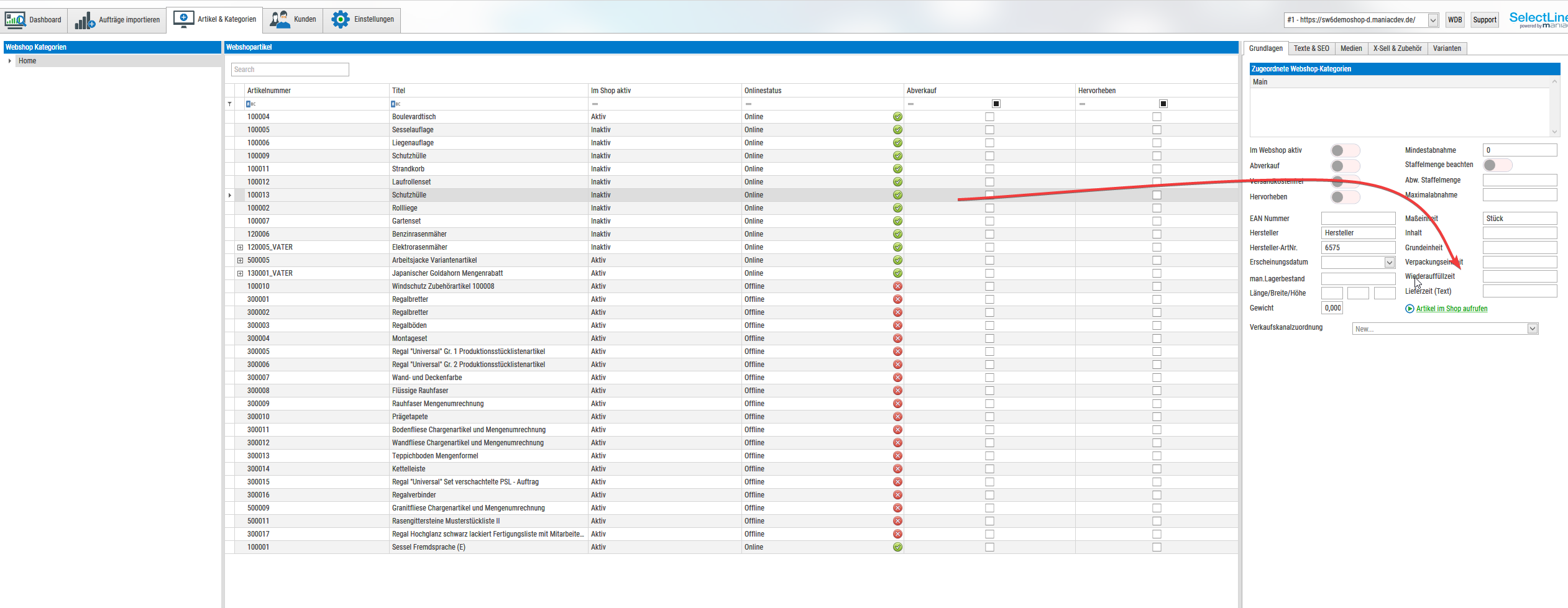Um die Wiederauffüllzeit Ihrer Artikel aus der SelectLine Warenwirtschaft korrekt an Ihren Webshop zu übertragen, müssen Sie das entsprechende Feld in der maniacSellerGen2 Schnittstelle einmalig zuordnen (mappen).