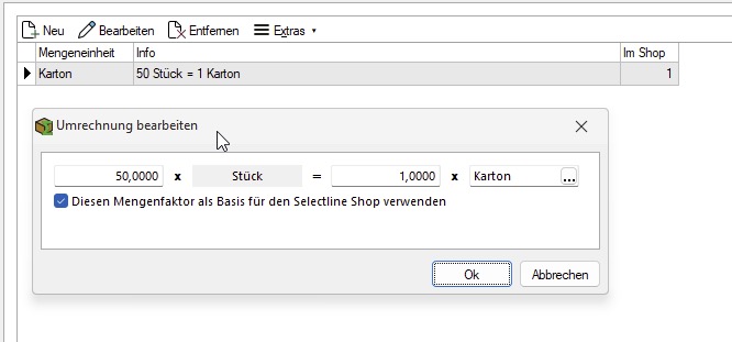 Die Mengenumrechnungen der SelectLine werden automatisch für die Mengenumrechnung beachtet, bei der der Schalter “Diesen Mengenfaktor als Basis für den SelectLine Shop verwenden” aktiviert ist.